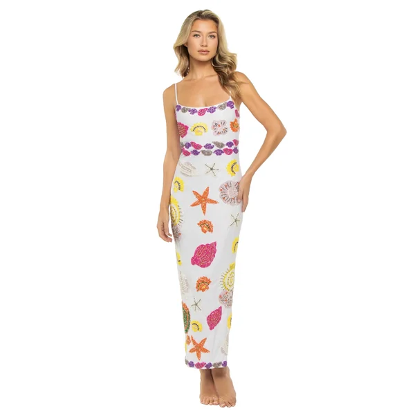 Maxi dress features hand-embroidered sea life motifs in vibrant, crystalized beading. Offers adjustable straps.