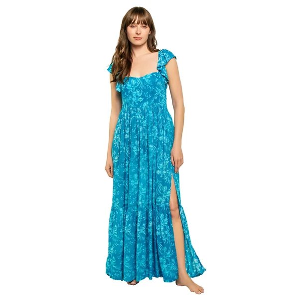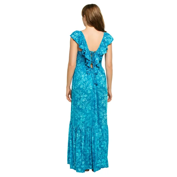 Maxi dress features a tropical floral print, ultra flowy silhouette, square neckline, ruffle cap sleeves, and ruffles cascade down the lace up back.