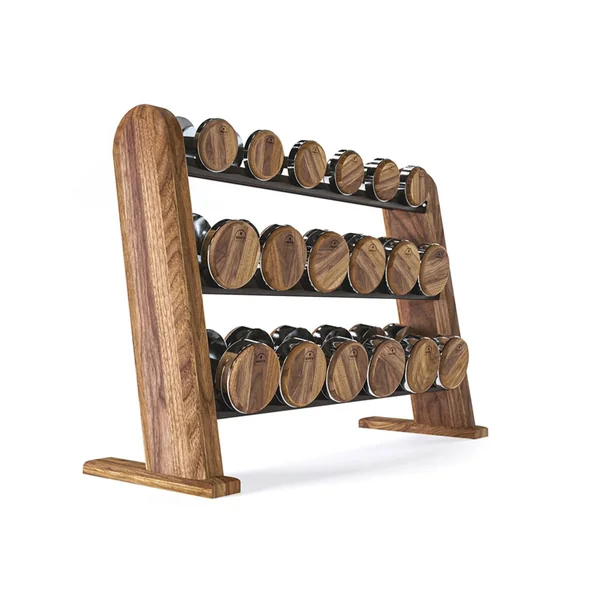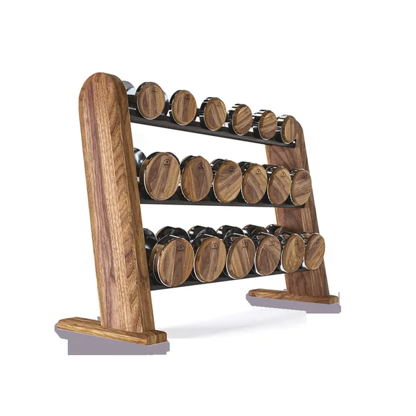 The NOHRD DumbBells storage rack, in a solid wood, angled frame, is a true organizer for your weights, as well as a space-saving solution. The rack has been constructed for extreme stability to safely hold 18 dumbbells and is suitable for use in the home or commercial gym.[/vc_column_text][/vc_column][/vc_row][vc_row full_width=”stretch_row” css=”.vc_custom_1701808652636{background-color: #e6e6e6 !important;}”][vc_column][vc_empty_space][vc_column_text]