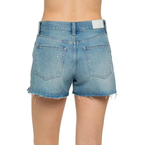 Nova denim shorts crafted from rigid non-stretch denim to hold its shape feature a raw-frayed hem with hints of distressing throughout.