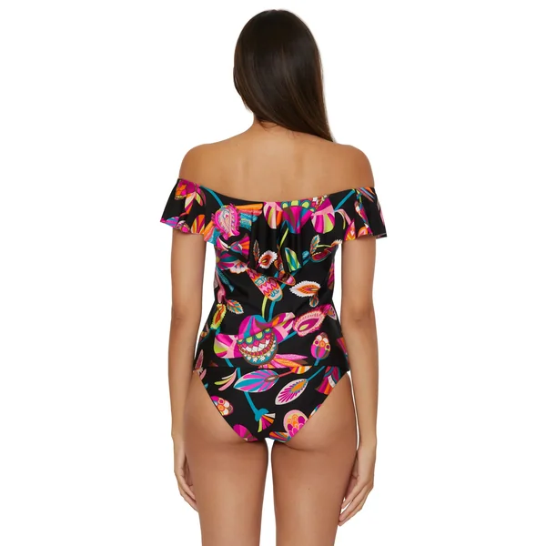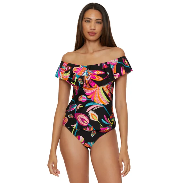 Bandeau tankini top features off-the-shoulder ruffle neckline and a shelf bra with removable soft cups.
