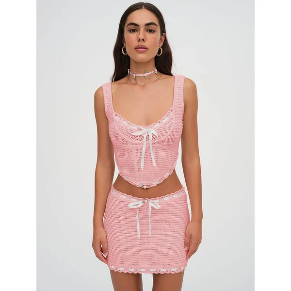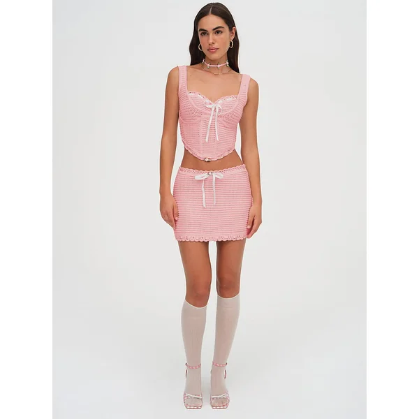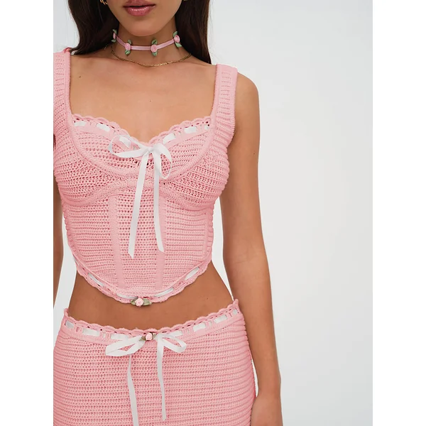 The sweetest spring top with a ‘70s feel, this crocheted corset-style top features a ribbon detail interwoven into the neckline and bottom hem for a feminine finish. Pair it with the Kelsey Mini Skirt for the complete look.