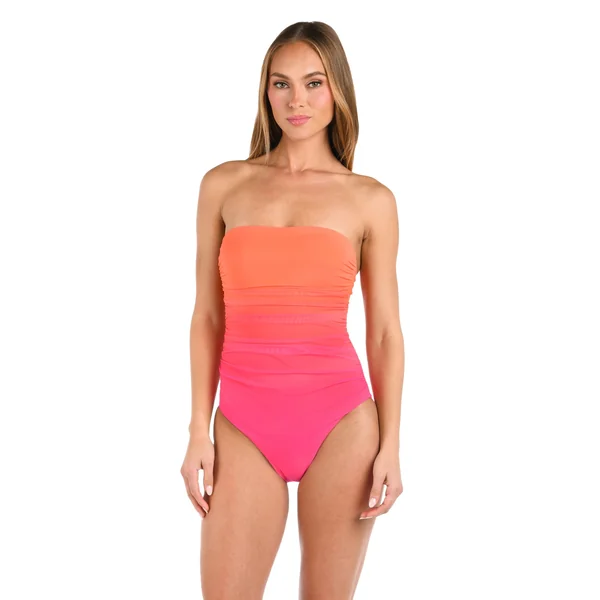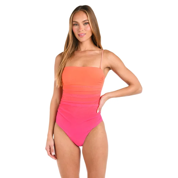 One piece swimsuit features ombre print with shirred mesh throughout. It offers removable soft cups, removable adjustable straps, tie back closure, and cheeky bottom coverage.