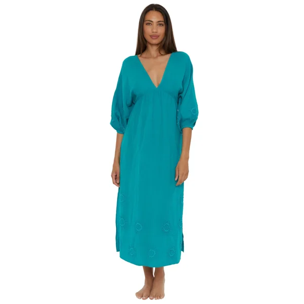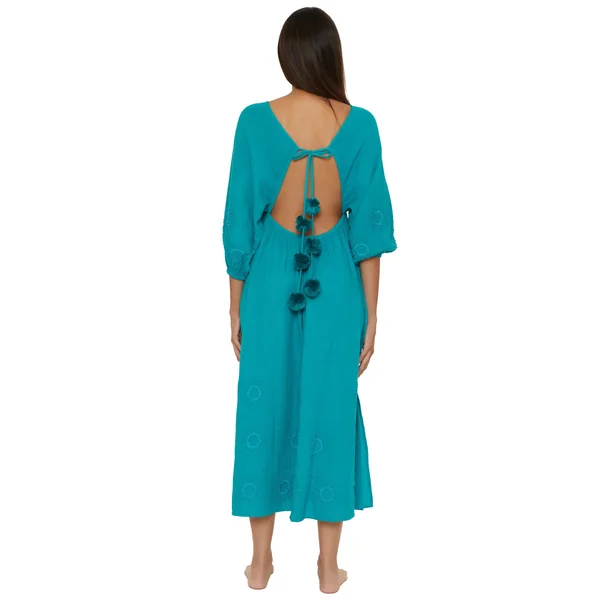 Maxi dress features deep v-neckline, embroidered 3/4 sleeves, open back, and back tie closure with pompom details.