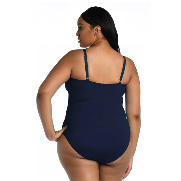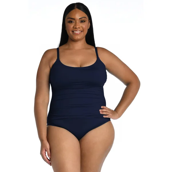 One piece swimsuit features shirred sides and offers removable cups, adjustable straps, tummy control and moderate coverage.