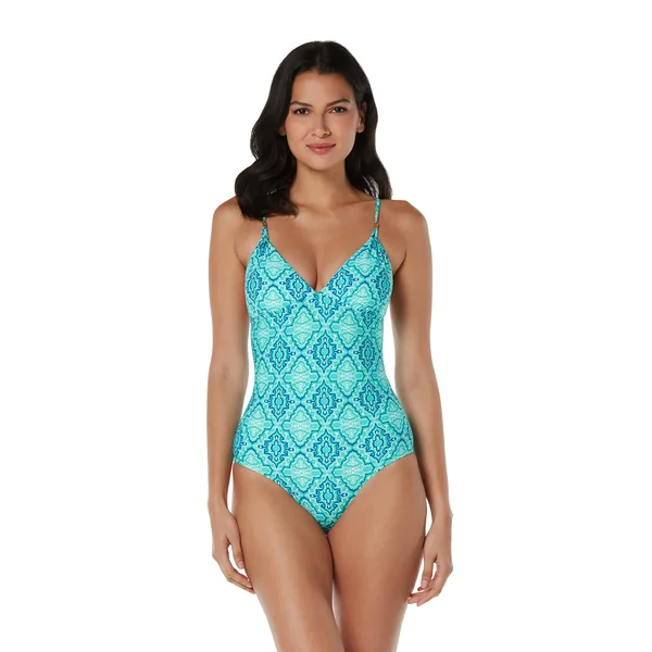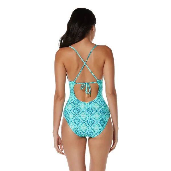One piece swimsuit features geometric tile print and gold bead details. Offers adjustable x-back straps with a tie closure, removable soft cups, underbust seam for support and moderate bottom coverage.