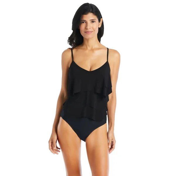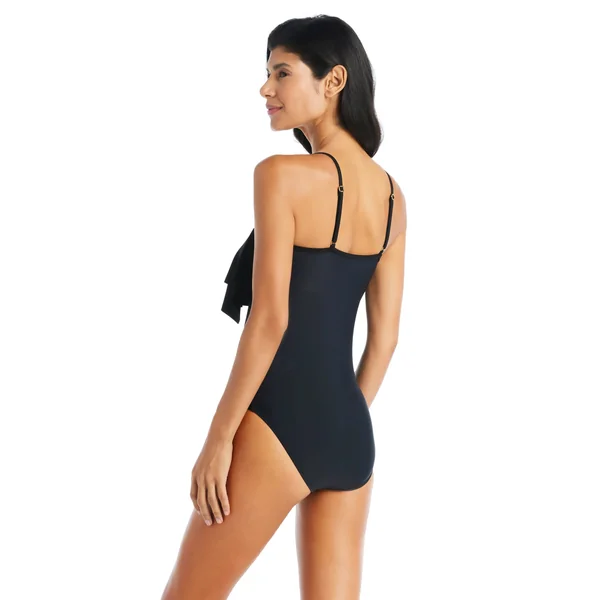 One piece swimsuit features a geometric overlay detail with soft cups and offers adjustable straps with full bottom coverage.