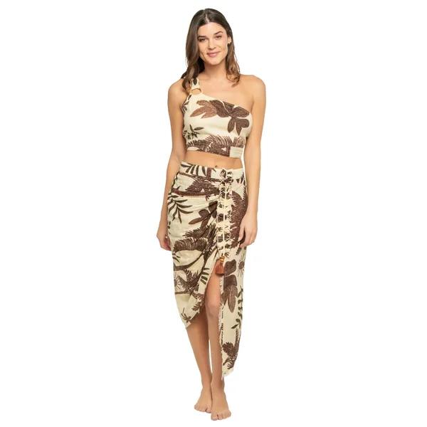 Crop top features tropical palm design, asymmetrical neckline, and a ring accent on one shoulder.