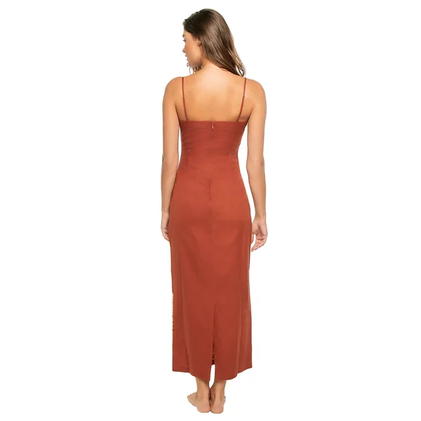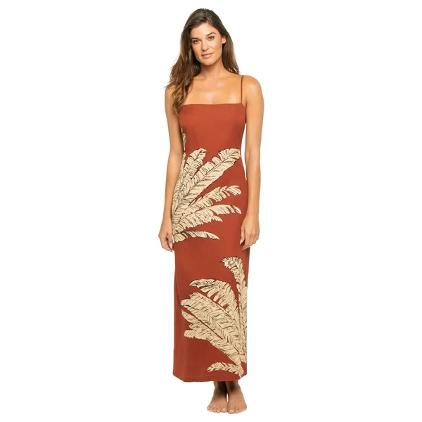 Midi dress features palm detailed print, adjustable spaghetti straps, and a back zipper.
