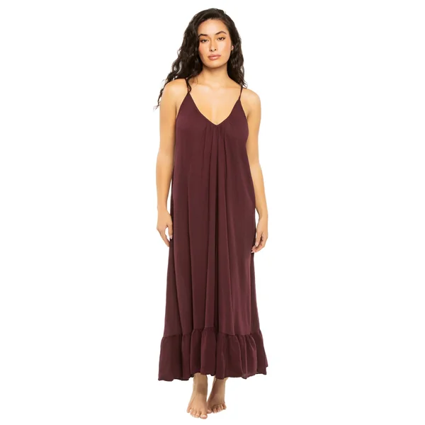 Paloma maxi dress features v-neckline, slim shoulder straps, and a ruffled hem.
