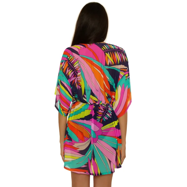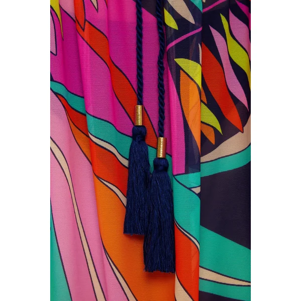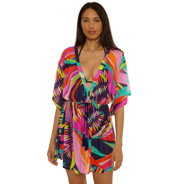 Mesh mini dress features colorful tropical print, plunge neckline, short sleeves and drawstring waist tie adorned with tassels.