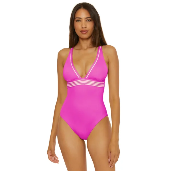 One piece swimsuit features a plunge neckline and textured striped under-bust band. Offers a shelf bra with removable soft cups, adjustable x-back straps, and moderate bottom coverage.