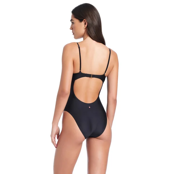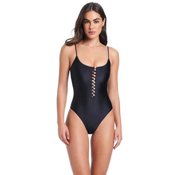 One piece swimsuit features shimmer fabric and a button down design with pearl hardware. Offers adjustable straps, a hook back closure, high leg cut and moderate bottom coverage.