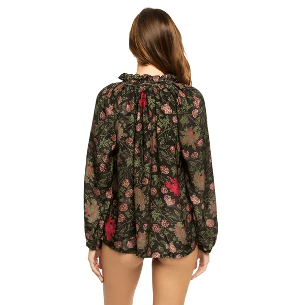 Penny silk blouse features v-neckline with tine and ruffled collar.