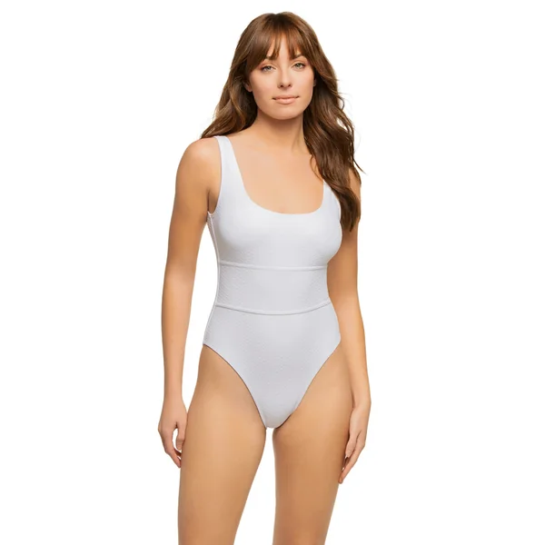 Perugia one piece swimsuit features a luxe tactile texture and a panel at the waist that sculpts and defines. Offers moderate bottom coverage.