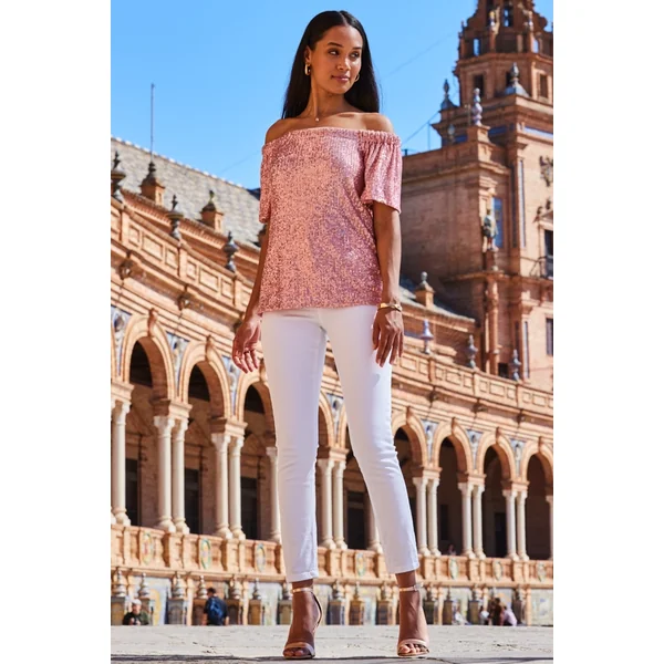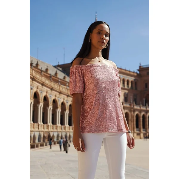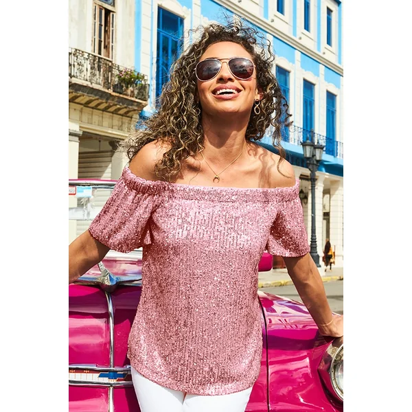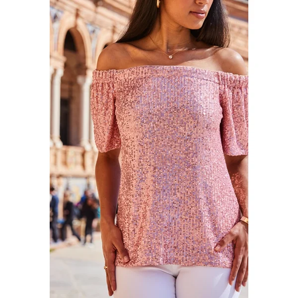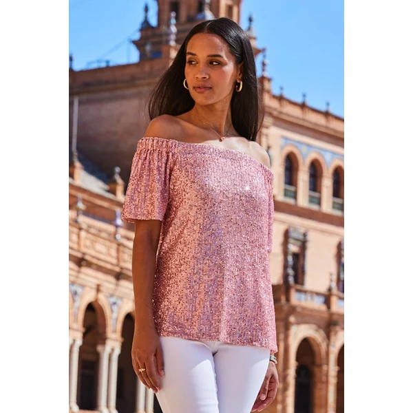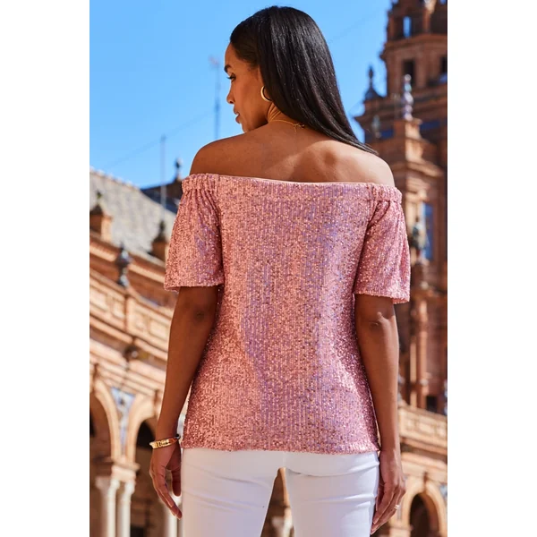 Be the first to review “Pink Sequin Bardot Short Sleeve Top”