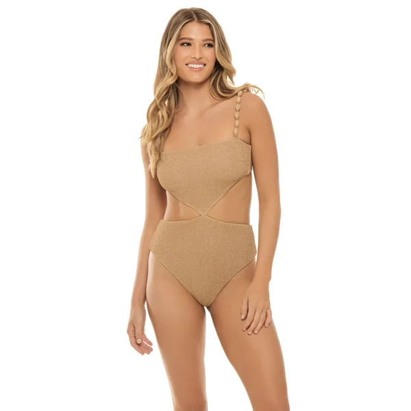 Pippa one piece swimsuit features a metallic texture with cutout sides and beaded strap details. Offers adjustable straps with a tie back closure and skimpy coverage.