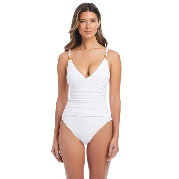 Textured one piece swimsuit features a deep v-neckline, adjustable straps with chain-link details, and a shirred bodice. Offers removable cups and moderate bottom coverage.
