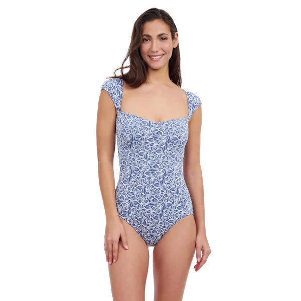 One piece textured swimsuit features cap sleeves, tummy control, and a keyhole back. Offers soft cups, clasp closure at back and full bottom coverage.