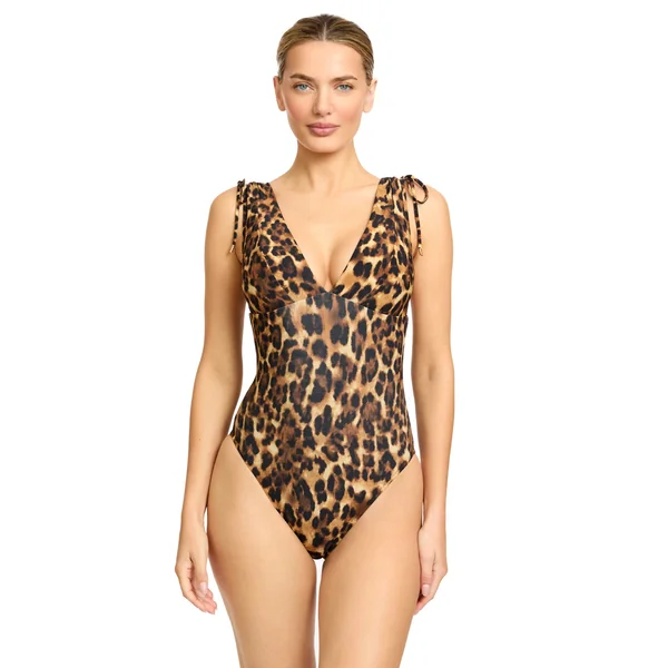 One piece swimsuit features a plunging neckline with animal-print ladder detail and gold grommets. Offers adjustable straps, removable cups, and moderate coverage.