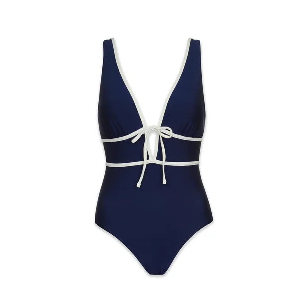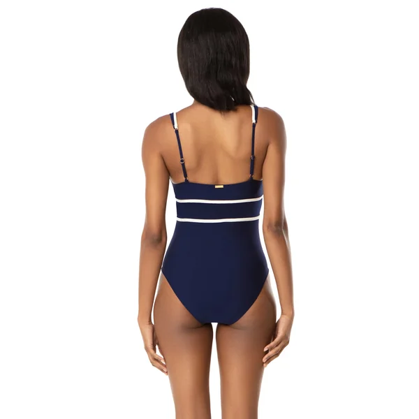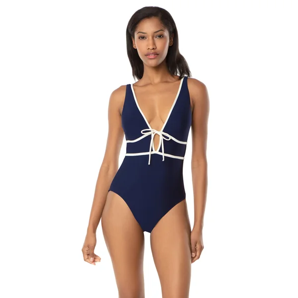 One piece swimsuit features contrast trim and a plunging neckline with tie. Offers adjustable straps and moderate coverage.