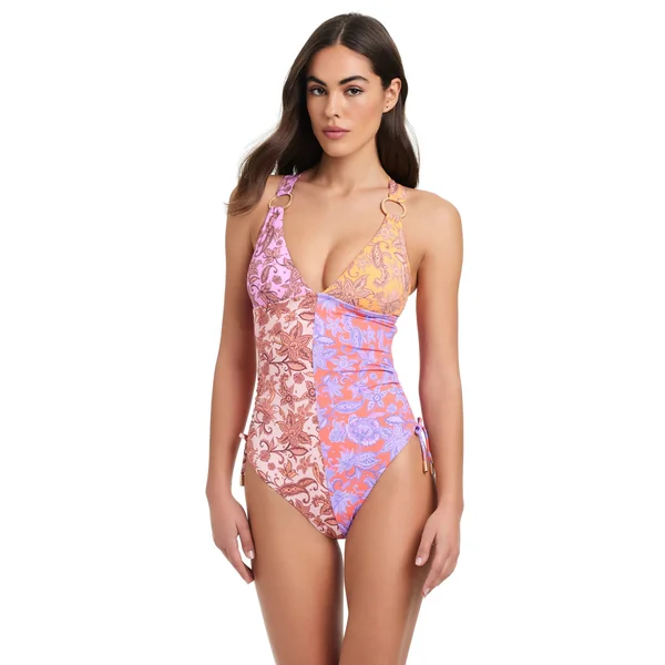 One piece swimsuit features a mixed colorblock pattern, gold plated ring details, and adjustable drawstring side ties. Offers adjustable x-back straps and a tie back closure.