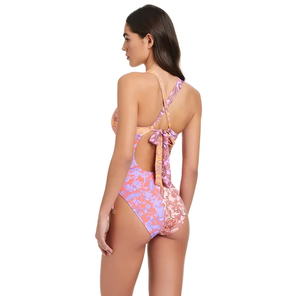 One piece swimsuit features a plunging neckline and wide straps with shoulder ties. Offers removable cups, a lace-up back, and moderate bottom coverage.