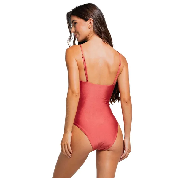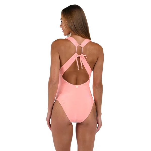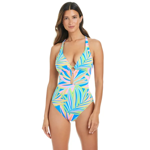 One piece swimsuit features plunging v-neckline with gold plated ring detail. Offers removable soft cups, adjustable tie back, and moderate bottom coverage.
