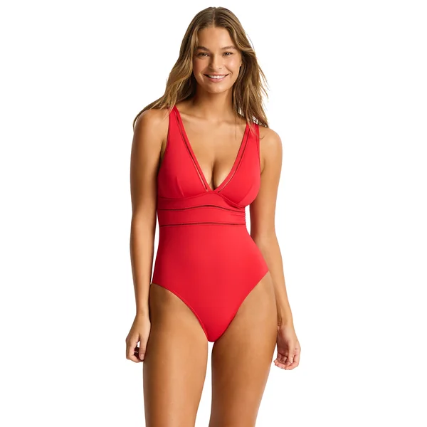 Textured one piece swimsuit features a plunging neckline and shoulders ties. Offers removable soft cups and moderate bottom coverage.