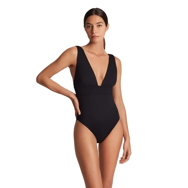 One piece swimsuit features a plunging neckline, underbust band and sculpting design. Offers removable cups and moderate bottom coverage.