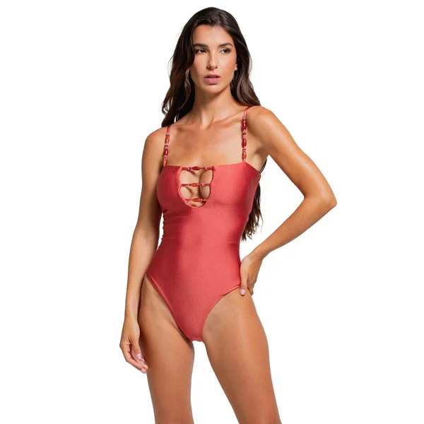 One piece swimsuit features a plunging neckline with beaded ladder tabs and beaded hardware on the shoulder straps. Offers adjustable straps and moderate bottom coverage.