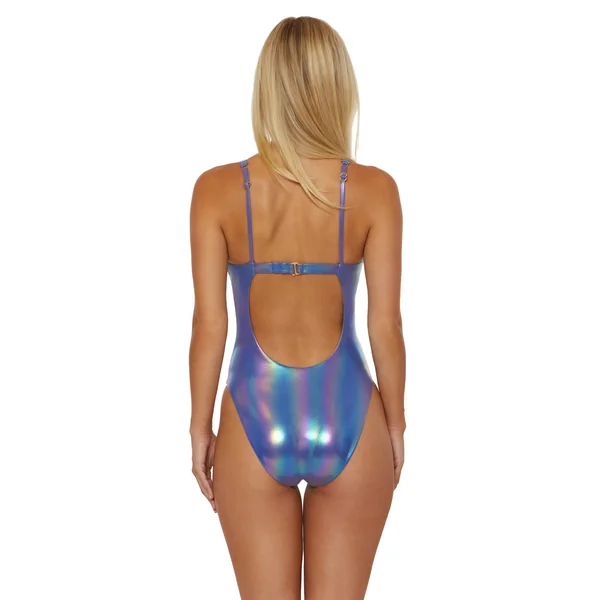 One piece swimsuit features metallic foil stretch fabric and plunging neckline with ties adorned with marbleized beads. Offers adjustable straps and a adjustable hook closure.