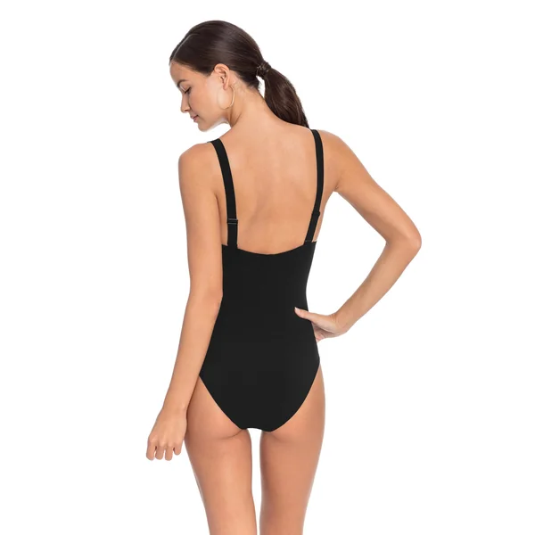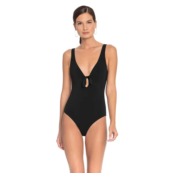 One piece swimsuit features a plunging neckline with a center bow tie and offers adjustable shoulder straps and moderate bottom coverage.