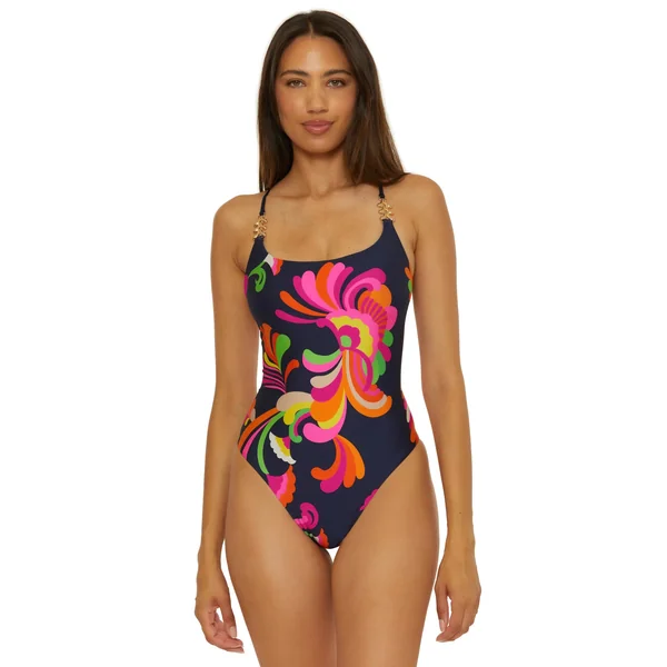 One piece swimsuit features gold plated hardware accents on the straps and a low back with unique twist detail. Offers removable soft cups, adjustable x-back straps, and moderate bottom coverage.