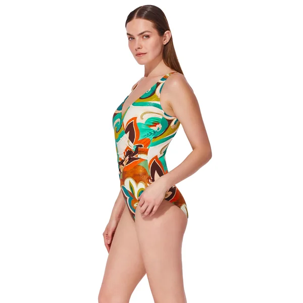One piece swimsuit features a surplice neckline with u-wire insert, built-in soft cups, tummy control, and adjustable straps. Offers full bottom coverage.