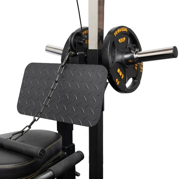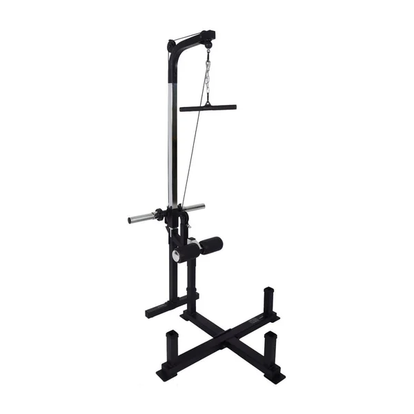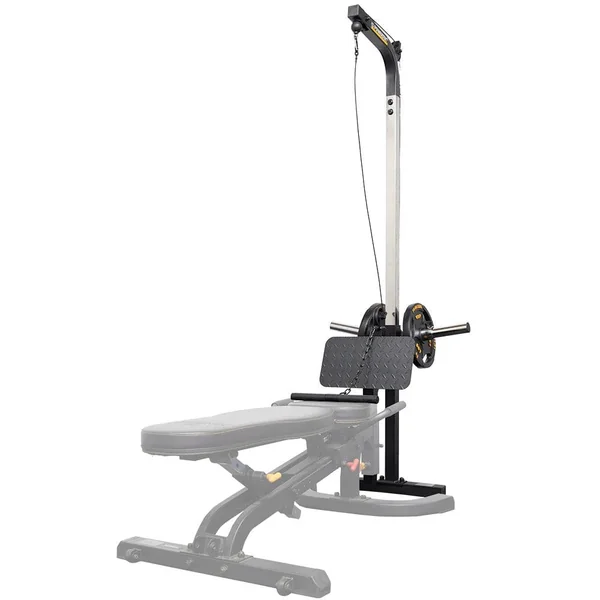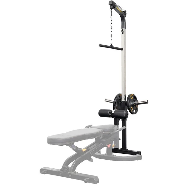 The Lat Tower Attachment comes with a long bar, short bar, extension chain, and the footplate used for seated rows, which can be interchanged with the Thigh pads (also included) for performing Lat Pulldowns.
