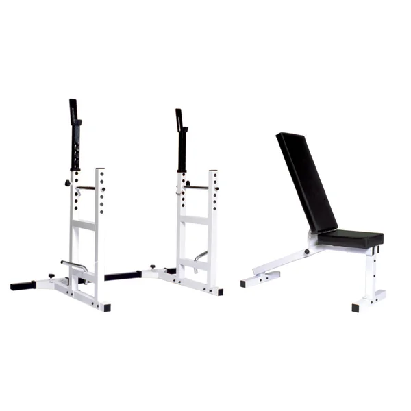 This combo set includes one #4224 incline-to-decline bench and one #4232 squat rack. Both units are crafted from 13 gauge steel for stability.
