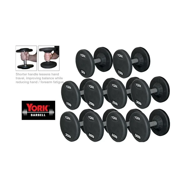 Perhaps one of the most ergonomically correct dumbbells on the market, York’s Pro Style Dumbbells feature a shortened fully knurled 30mm solid steel handle. The shorter handle results in less hand travel and optimum control of the dumbbells during exercise. The Pro Style Dumbbell heads are comprised of solid steel inserts fully encased in virgin rubber. The solid steel handle passes through the steel insert and is welded, permanently joining the head to the handle. The virgin rubber coating increases durability, protects flooring and equipment, enhances appearance, diminishes noise, and is easy to clean. Pro Style Dumbbell Sets are available in 5-50 lb., 55-100 lb., 105-125 lb., 130-150 lb.