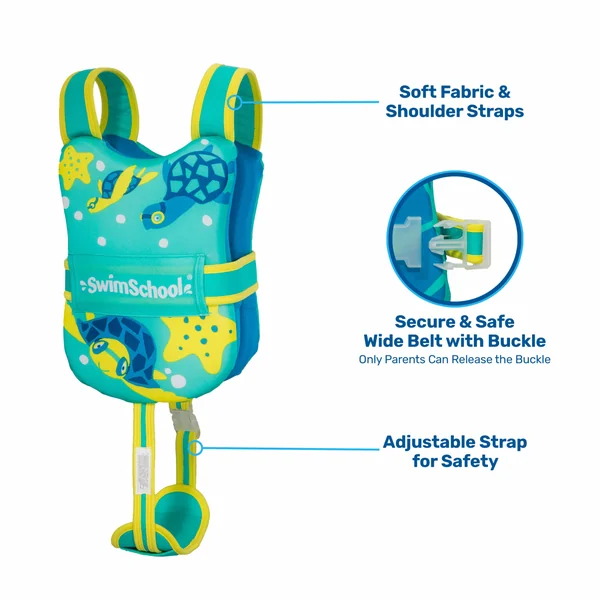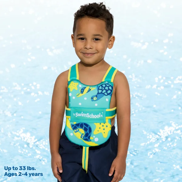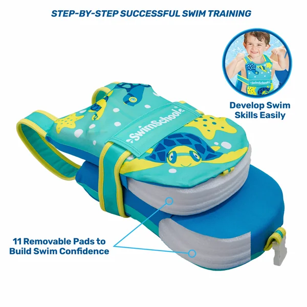 The Progressive Toddler Swimming Float Vest is an inflatable swimming aid to help develop swim skills with ease of mobility. The buckle in the back and adjustable safety strap provide a secure fit to assure your child stays safe while learning to swim. As your child’s skills improve and they gain swim confidence, you can reduce the inner floatation foam pads with this graduated swim training system. Hidden pockets keep the foam floatation pads secure. One size fits all. Recommended ages: 2-5 years, 38 lbs. maximum