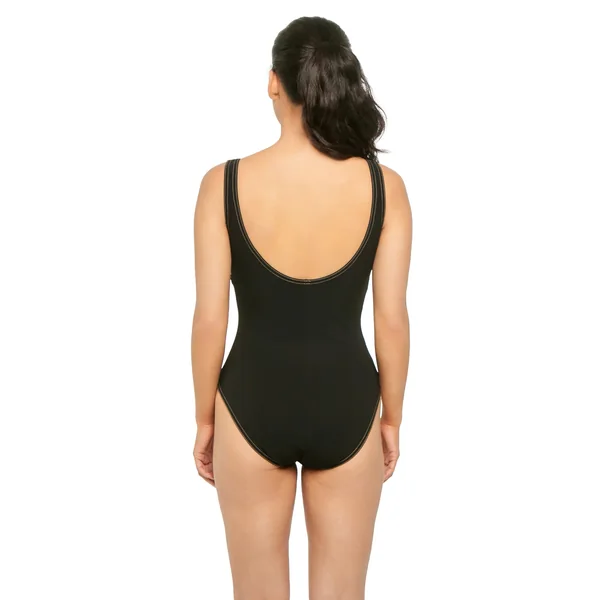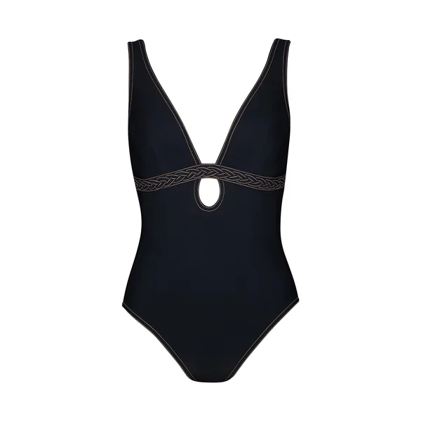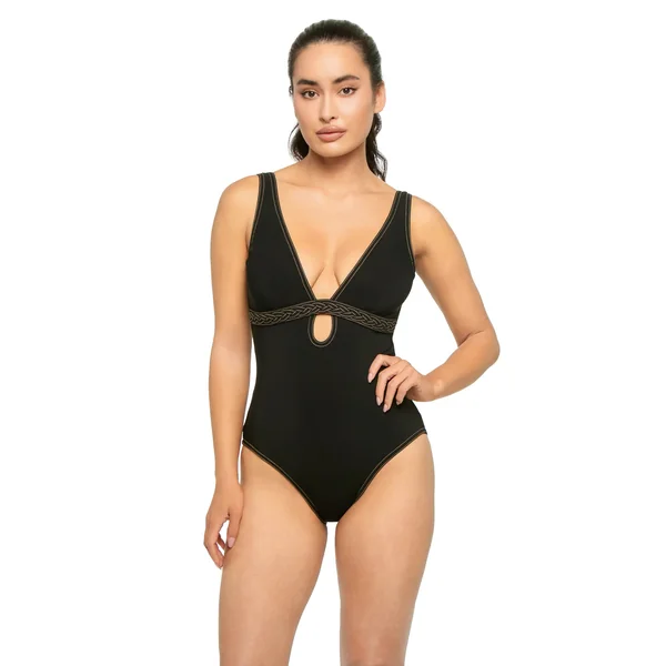 One piece swimsuit features a plunging neckline with a teardrop cut-out, braided under-bust band and contrast stitching. Offers moderate bottom coverage.