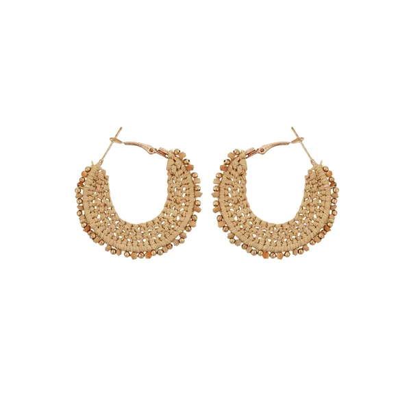 Earrings feature raffia wrapped hoops with gold plated and wooden beads. Offers a post lever back closure.