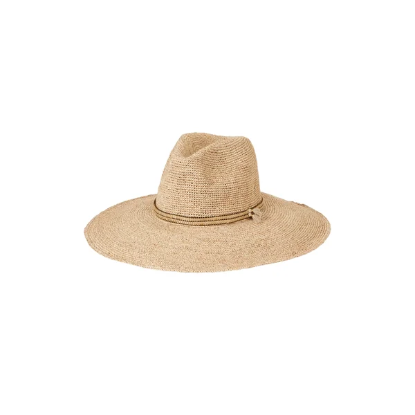 Panama hat is handcrafted from raffia with metallic thread. Features a woven braid and a metallic band adorned with tassel accents.