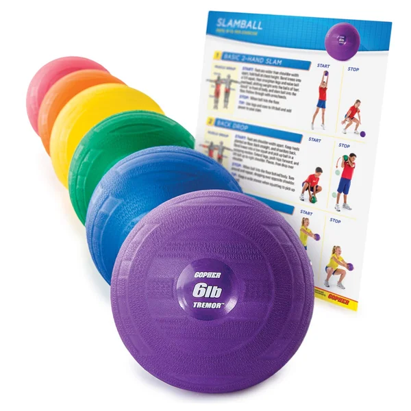 Our only slam ball designed specifically for beginners offers a fun and effective workout that blends strength and cardio. Sand-filled slam balls are encased in a thick rubber cover for serious impact absorption. They will withstand repeated slams by multiple students in an institutional setting! Ultra-textured cover features unique molded channels that enhance grip for safety and control during fast-paced slams, throws, and catches. The 7″ dia fits well in smaller hands, and paired with the lighter 6 lb weight, gives students confidence as they focus on proper form. Set of 6 includes laminated activity guide to walk students through 6 beginner slam ball movements.
