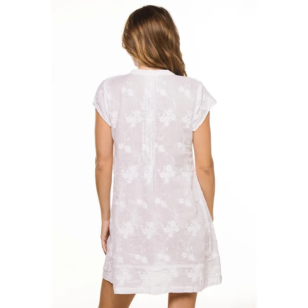 Regina tunic features a cap sleeve, pleat detail and v-neckline.