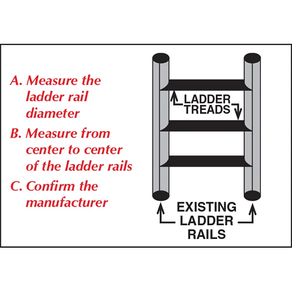 Replacement 20″ blow-molded plastic step for swimming pool ladders is installes on vertically straight post and includes mounting hardware. Shipping Weight: 2 lbs. To determine the correct size tread, measure your existing ladder rail diameter and from center to center of both rails, as shown in the illustration below.