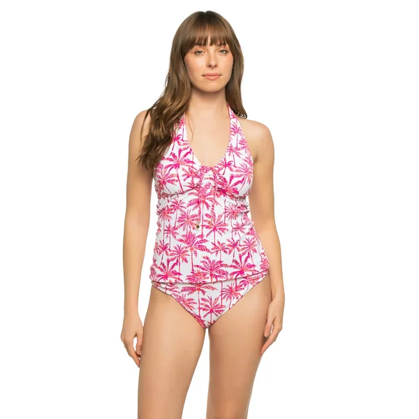 Textured tankini top features a reversible print, a tie-front detail adorned with hammered gold charms, and an adjustable halter tie.
