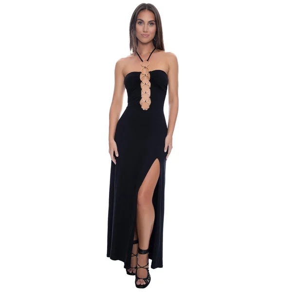 Maxi dress features a plunging neckline with gold-plated ring accents, slit skirt, and offers an adjustable tie back closure with strappy detailing.