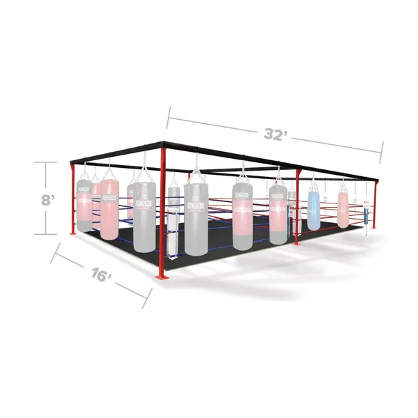 Complete a gym build out in one, easy step. The Deluxe Instant Gym is the most efficient training apparatus available. It includes not one, but two 16’ floor rings (each measuring 12’ inside the ropes) and space to hang an unbelievable eighteen bags. It is durably constructed of strong 2”x 4” square tubing and 2 ½” ring posts that securely bolt to the floor. The entire unit requires 16’ x 32’ of space. Bags and flooring sold separately.