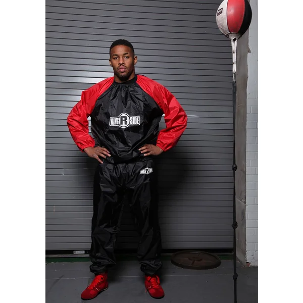 The Ringside Super Nylon Sweat Suit is made of a heavy-duty machine washable nylon, not plastic. Elastic gathering at openings insures sauna effect. Double stitched seams for durability.