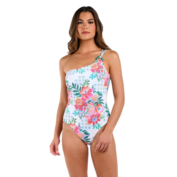 One piece swimsuit features an asymmetrical neckline, adjustable strap with raffia ring detail, tummy control and offers moderate coverage.